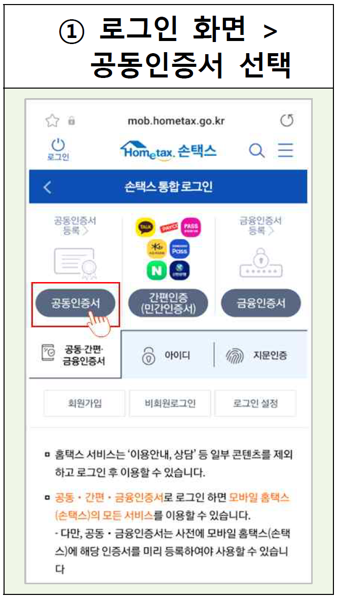 ① 로그인 화면 > 공동인증서 선택