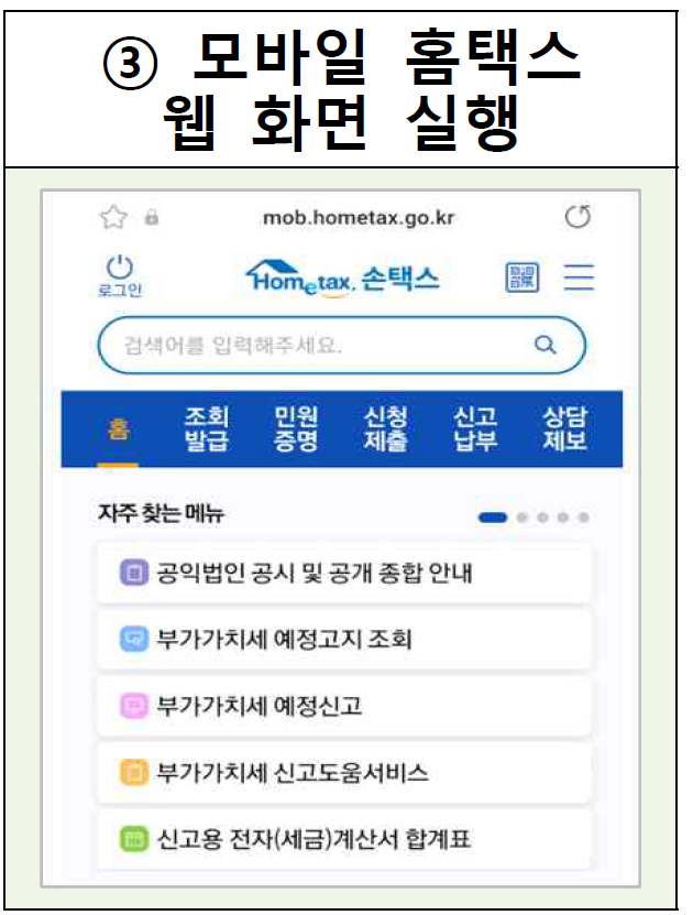 ③ 모바일 홈택스 웹 화면 실행