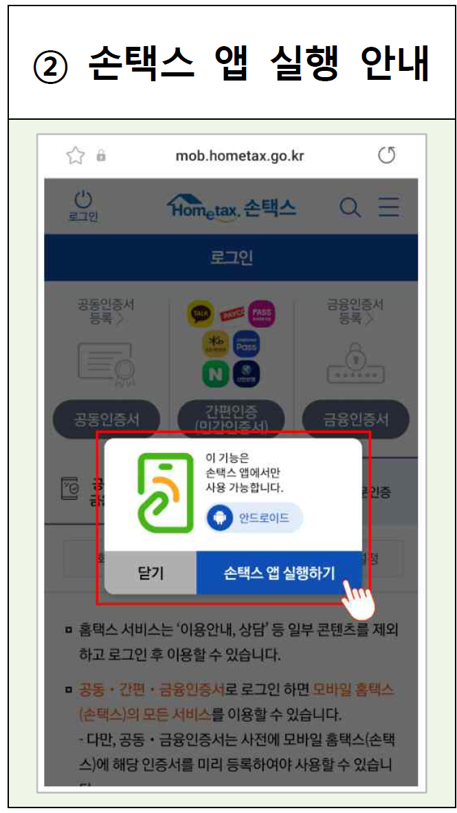 웹 화면에서 공동인증서, 생체인증을 선택하는 경우 손택스 앱이 설치되어 있으면 앱이 바로 실행되도록 지원하고, 앱이 설치되어 있지 않으면 플레이스토어, 앱스토어로 이동하여 앱 설치를 안내합니다.