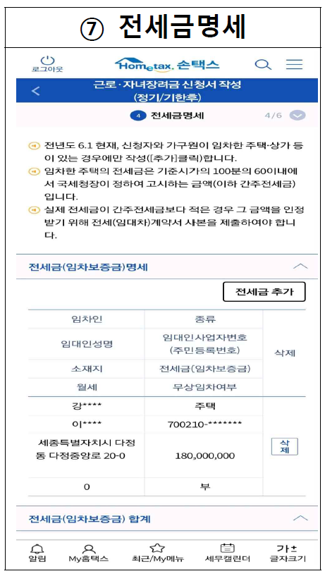 전세금명세 : 전년도 6.1 현재, 신청자와 가구원이 임차한 주택 상가 등이 있는 경우에만 작성합니다.