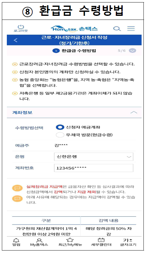환급금 수령방법 : 근로장려금, 자녀장려금 수령방법을 선택할 수 있습니다.