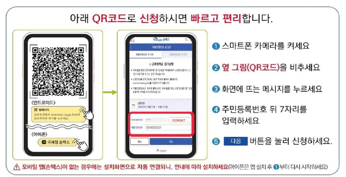 - 스마느폰 카메라를 켜서 큐알코드를 비추면 생성되는 메시지를 누르고 신청화면에서 주민등록번호 뒤 7자리를 입력하여 신청합니다.