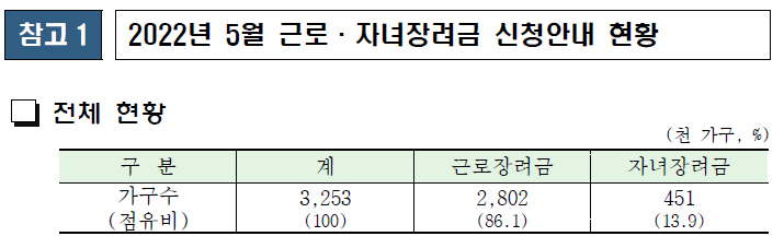 * 자녀장려금은 18세 미만(중증장애인은 연령제한 없음)의 부양자녀가 있어야 함