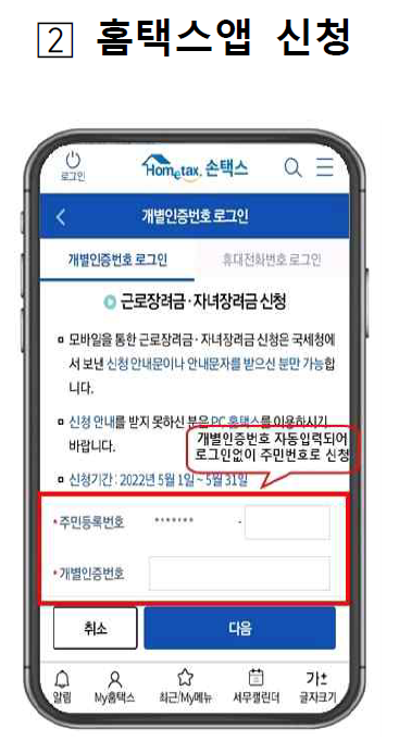 - 신청안내문을 받지 못했지만 신청요건을 충족한 경우, 작년까지는 홈택스(PC)로만 신청할 수 있었으나, 올해부터는 홈택스앱으로도 신청할 수 있습니다.